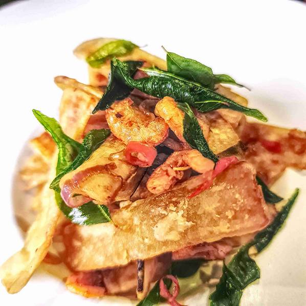 Sauteed thin slice Eggplant with Dried shrimp (Sharing menu)