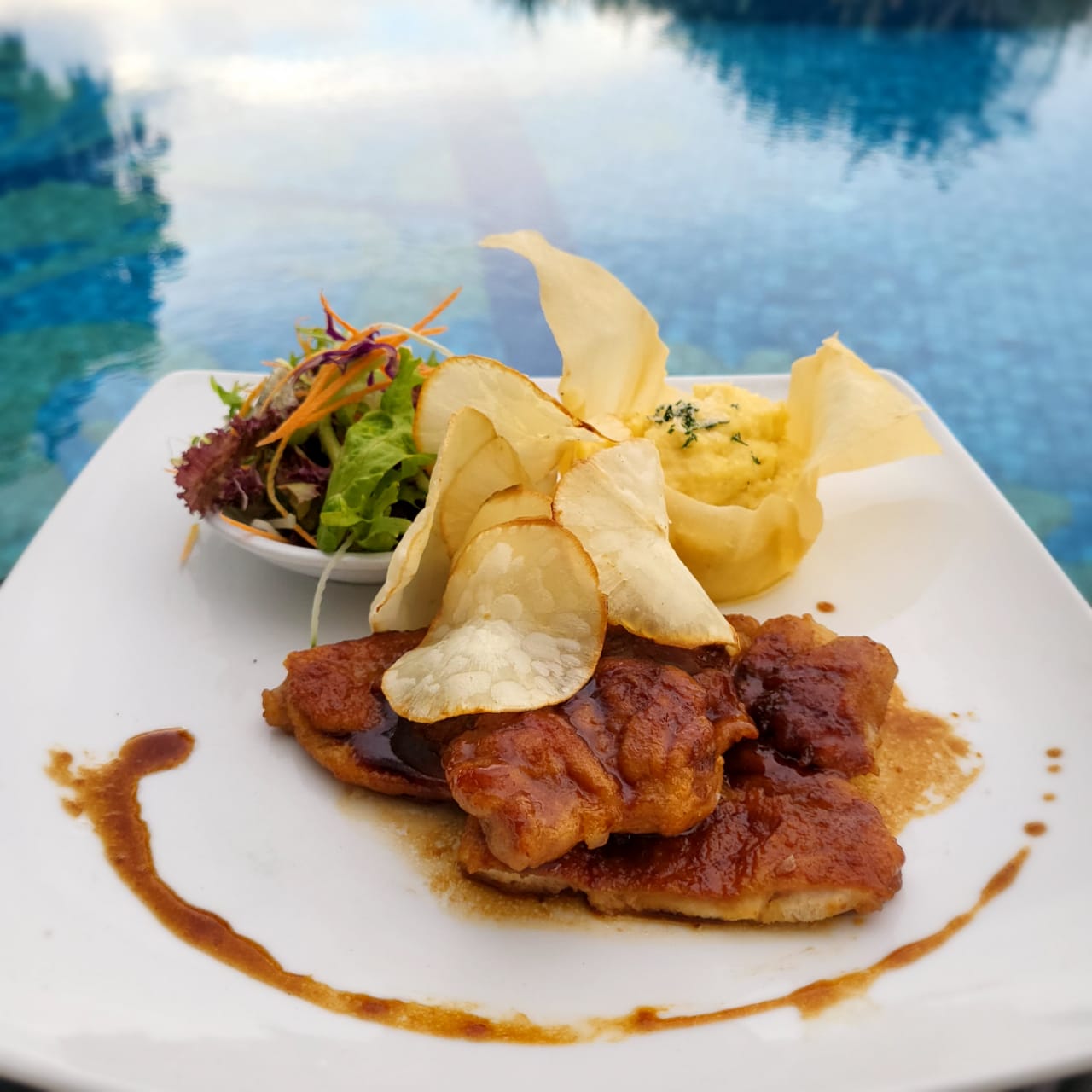 Chicken Teriyaki Chicken fillet served with Mashed potato, Green salad, with Teriyaki sauce and Cassava chips on top Rp 148.000 Available - +