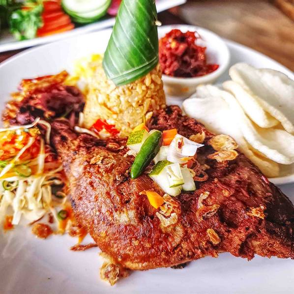 Bebek Kebuli Marinated Duck served with Kebuli Rice, Vegetables Grated Coconut, Slice Omelet Caramelized Soya Bean Cake, Sambal, and Crackers | Rp 186.000 Available - +