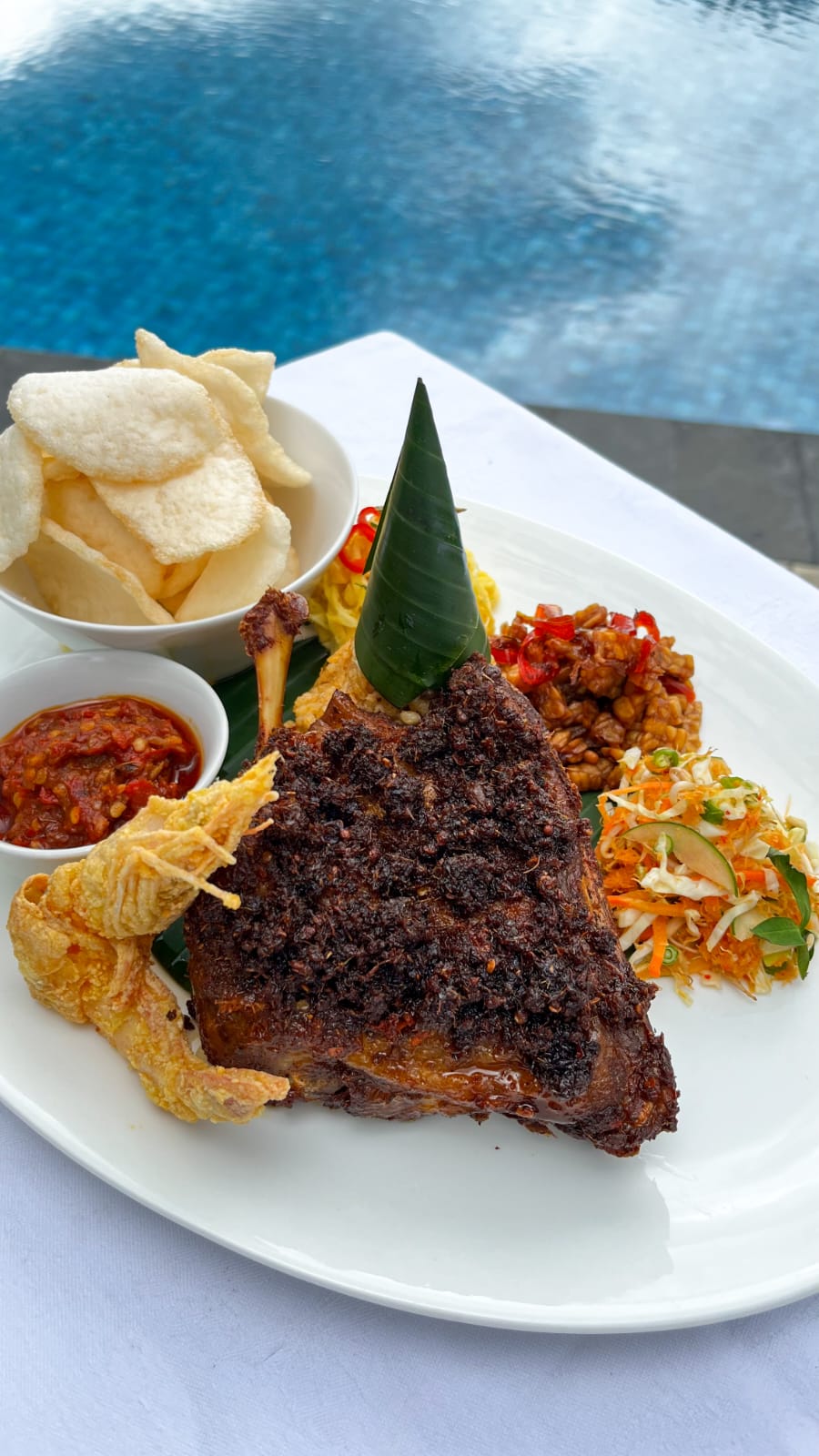 Bebek Bumbu Hitam Marinated duck served with Kebuli rice.Fried Prawn , Vegetables grated coconut, Slice omelet Caramelized soya bean cake, Sambal, and Crackers Rp 186.000 Available - +